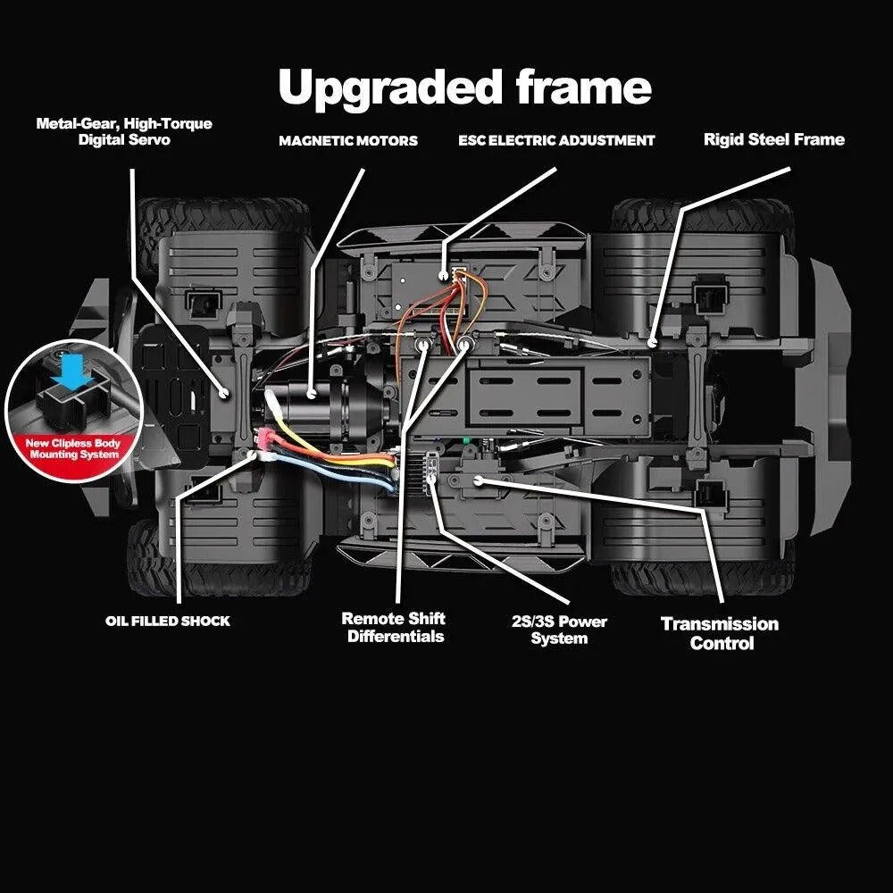 4-Servo Advanced Control – Dedicated servos for steering, gear shift, front diff lock, and rear diff lock for precise operation.